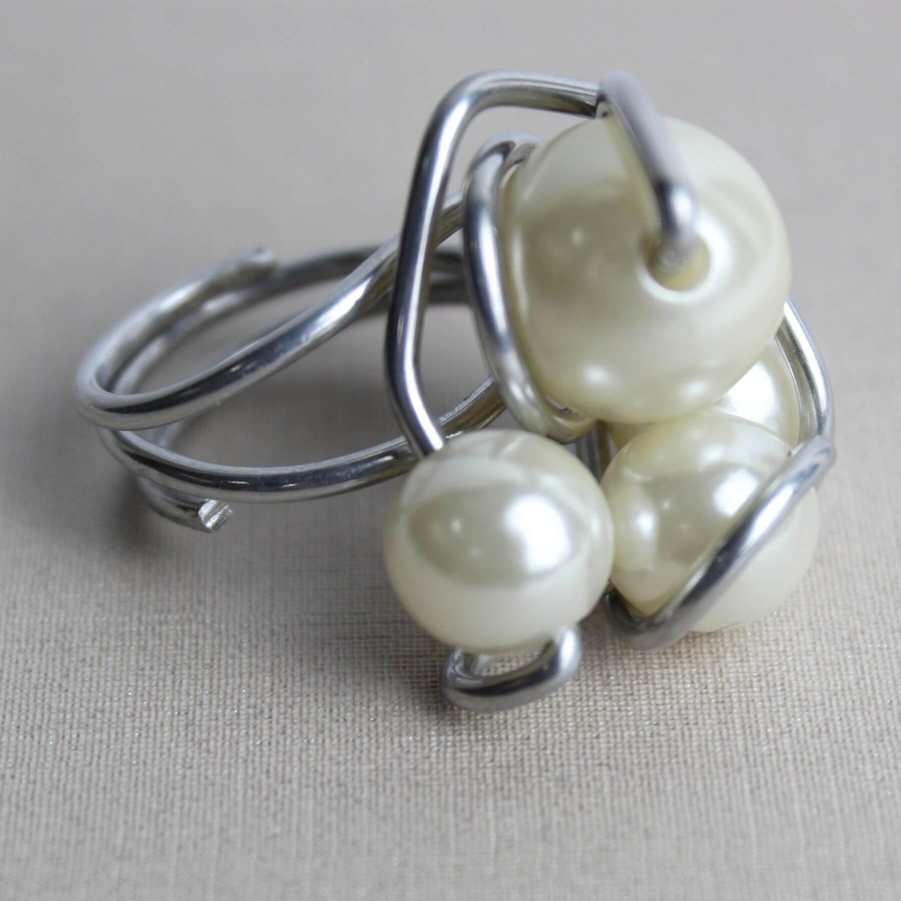 Composição elegante: Três pérolas em diferentes tamanhos envoltas por curvas metálicas