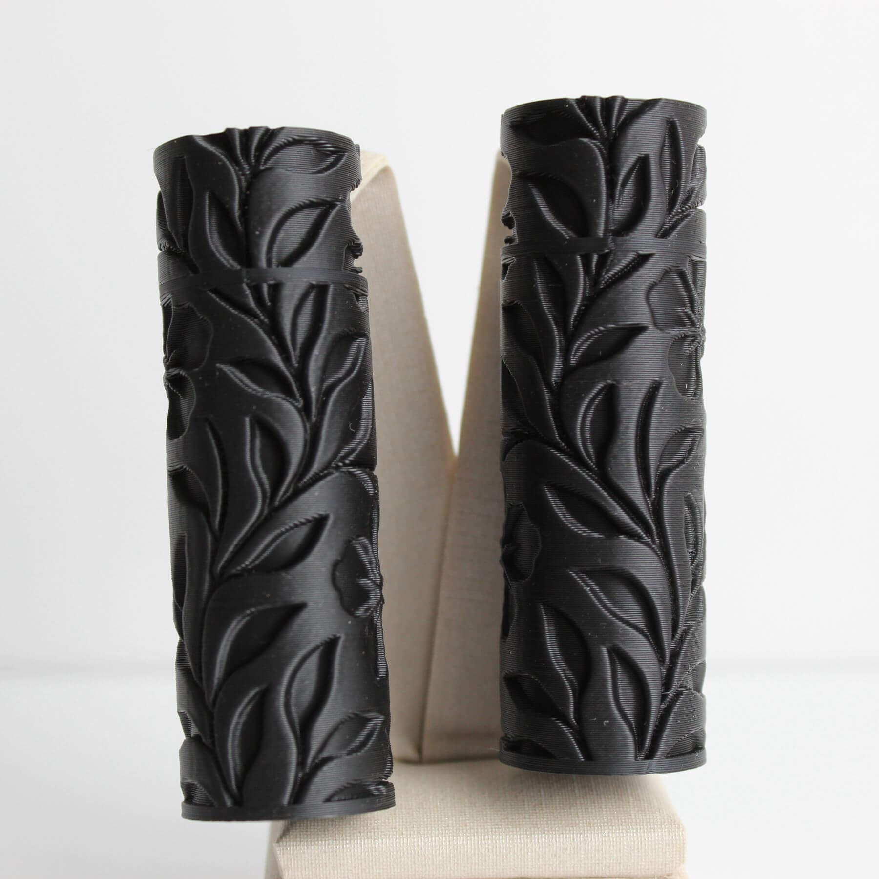 Formato cilíndrico vertical com textura floral em alto-relevo